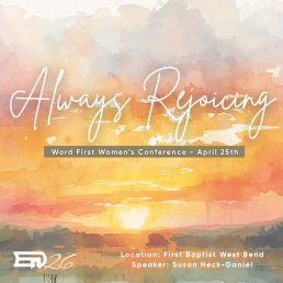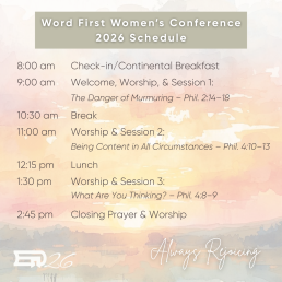 Today, a lot of different things could have brought you joy. The paycheck that had a bonus attached, the perfectly clean kitchen, a loving embrace, your favorite show, or maybe the arrival of the Amazon box on your doorstep all have the ability to bring us joy, but none of them are able to give us joy that lasts. For lasting joy, we have to look to God and His Word. The burden of our 2026 Women’s Word First Conference is that by looking at God’s Word first and foremost in our lives, we can see how we can rejoice always, instead of the temporary joy the world has to offer.